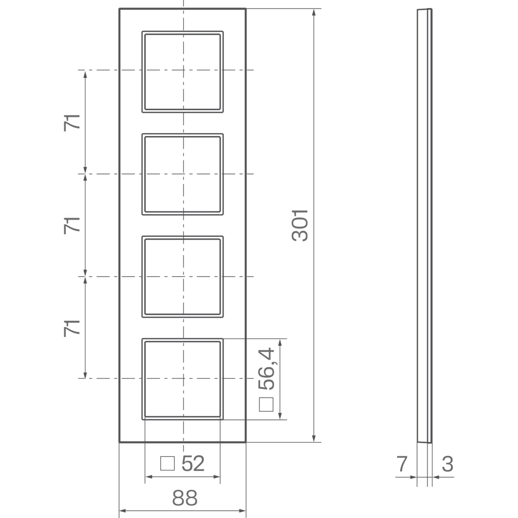 Hager Berker 4-voudig afdekraam, voor verticale montage, A.8, aluminium (geanodiseerd, geborsteld). Afm.: 88x301x10mm.