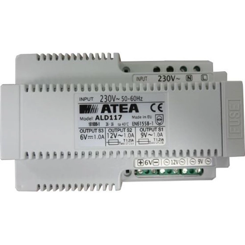 ATEA voeding ALD117, laat zich eenvoudig integreren in een schakelkast. DIN-rail montage. Output: 6V DC=1.0A, 12V AC=1.0A, 9V AC=1.0A. Voor het voeden van een ATEA parlofooninstallatie. Meer informatie »