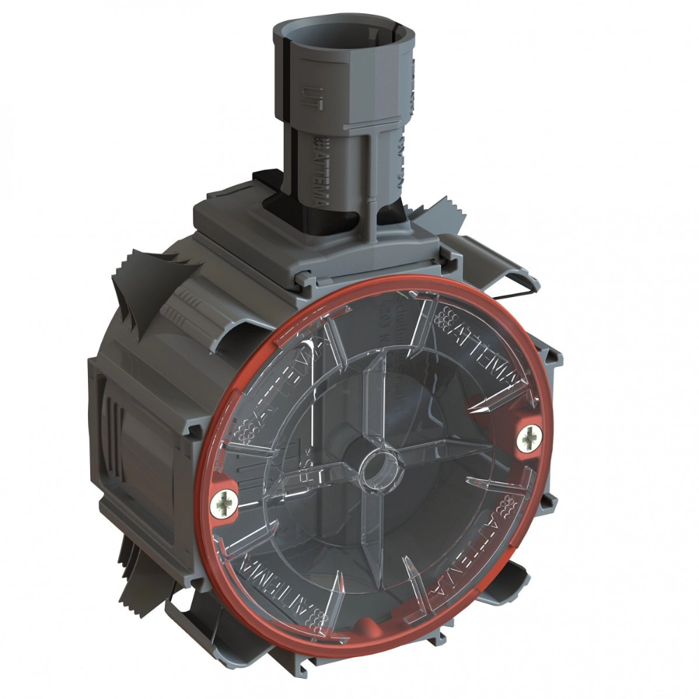 Attema AT1112.01 inbouwdoos U40. Heeft een flexibele afneembare buiktuit en is geschikt voor een buis van 16/19 of 20 mm. Diameter 80 mm, inwendige diepte 40 mm. Voorzien van 360 graden draaibare ring.
