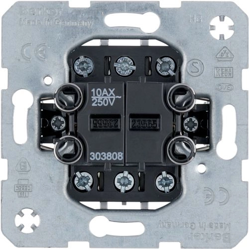 Hager Berker 2-voudige wisselschakelaar (wissel-wisselschakelaar), toepasbaar in hotelschakelingen, 10 A. Met klauwbevestiging (spreidklemmen). Excl. schakelwip en afdekraam.