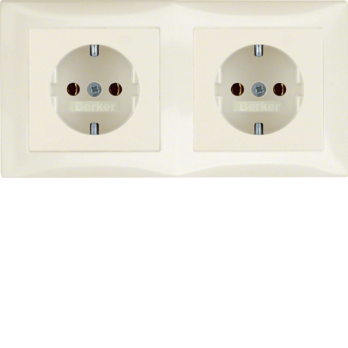 Berker voorbedraad dubbel stopcontact met randaarde en afdekraam, serie S1 in crème glans. Alleen geschikt voor duo-inbouwdoos, niet voor twee losse inbouwdozen. Bij afzonderlijke montage losse wcd’s en dubbel afdekraam nodig.