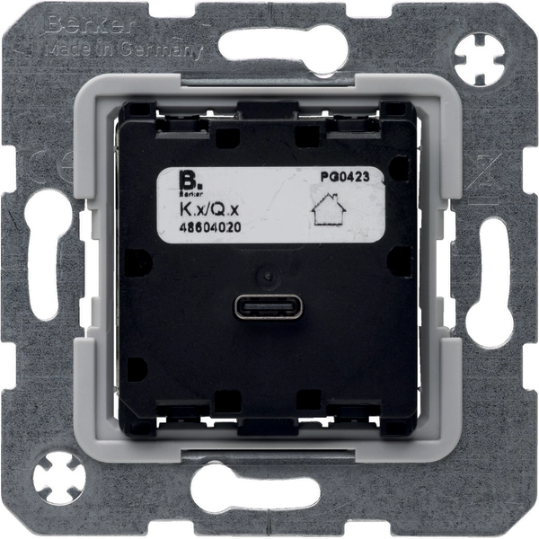 Hager Berker USB-wandcontactdoos met USB-C-poort voor snel opladen van smartphones en tablets. Ondersteunt USB PD 3.0, PPS, BC1.2, Apple 2,4 A, Samsung 2 A en QC4.0. Uitgang: max. 65 W (max. 3,25 A). Geschikt voor Berker series K.1/K.5/Q.1/Q.3/Q.7. Afdekken met centraalplaat en afdekraam.