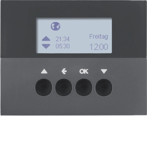 Hager Berker schakelklok opzetmodule voor jaloeziebesturing, K1, antraciet mat. Handmatige, tijdgestuurde en automatische jaloezie- en rolluikbediening. Niet geschikt voor verlichting. Excl. binnenwerk en afdekraam.