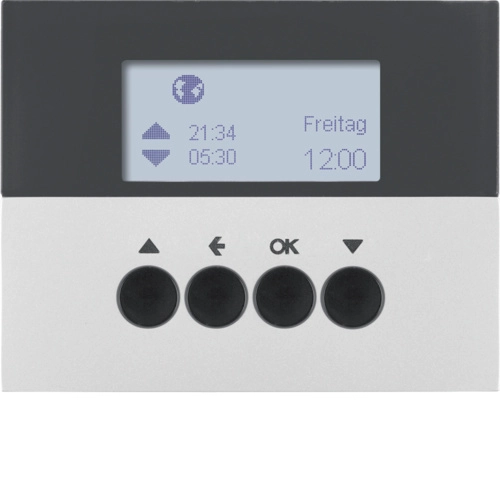 Hager Berker schakelklok opzetmodule voor jaloeziebesturing, K5, aluminium mat. Handmatige, tijdgestuurde en automatische jaloezie- en rolluikbediening. Niet geschikt voor verlichting. Excl. binnenwerk en afdekraam.