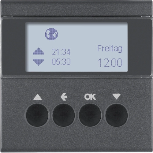 Hager Berker schakelklok opzetmodule voor jaloeziebesturing, S1/B3/B7, antraciet mat. Handmatige, tijdgestuurde en automatische jaloezie- en rolluikbediening. Niet geschikt voor verlichting. Excl. binnenwerk en afdekraam.