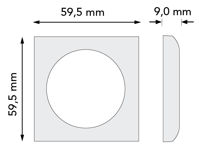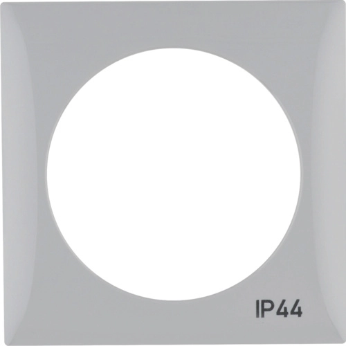 Hager Berker afdekraam 1-voudig, 59,5 × 59,5 × 9 mm, met opdruk IP44. Serie Integro Flow in glanzend grijs. Ideaal voor o.a. (bad)meubels, caravans en boten. Niet geschikt voor standaard muurmontage.