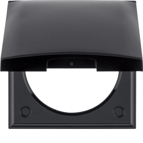Hager Berker afdekraam 1-voudig met klapdeksel, 59,5 × 59,5 × 17,9 mm. Serie Integro Flow in glanzend zwart. Ideaal voor o.a. (bad)meubels, caravans en boten. Niet geschikt voor standaard muurmontage.