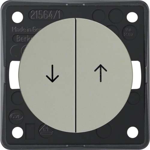 Hager Berker impulsdrukker voor jaloeziebediening met pijlsymbolen en beveiliging tegen gelijktijdige bediening van beide kanten. Serie Integro Flow in edelstaal (mat gelakt thermoplast). Voor o.a. (bad)meubels, caravans en boten. Niet voor standaard muurmontage.