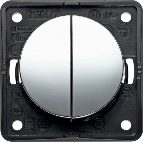 Hager Berker serieschakelaar 10 AX, voor het schakelen van twee lichtpunten vanaf één plek. Niet geschikt voor wisselschakelingen. Serie Integro Flow, glanzend chroom. Voor o.a. (bad)meubels, caravans en boten. Niet geschikt voor standaard muurmontage.