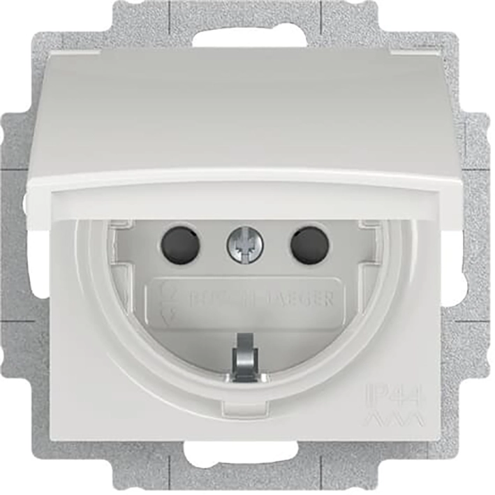 Busch-Jaeger stopcontact randaarde Safety+ (kindveilig) met klapdeksel en spreidklemmen, Balance SI, wit glans. Incl. afdichtingsring (IP44), excl. afdekraam.