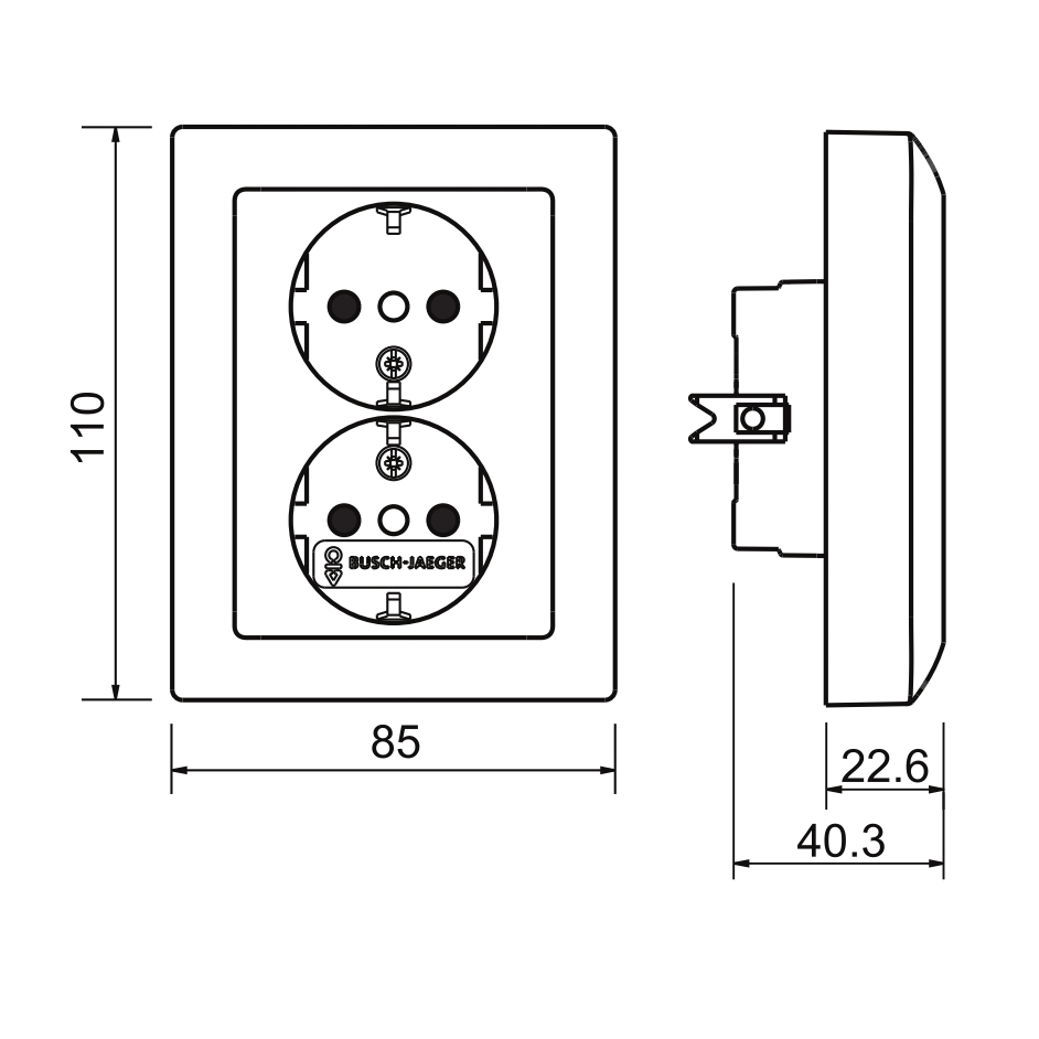 Busch-Jaeger dubbel stopcontact met randaarde en verhoogde aanraakbeveiliging, Balance SI, wit glans. Geschikt voor enkele inbouwdoos. Met klauwbevestiging/spreidklemmen.