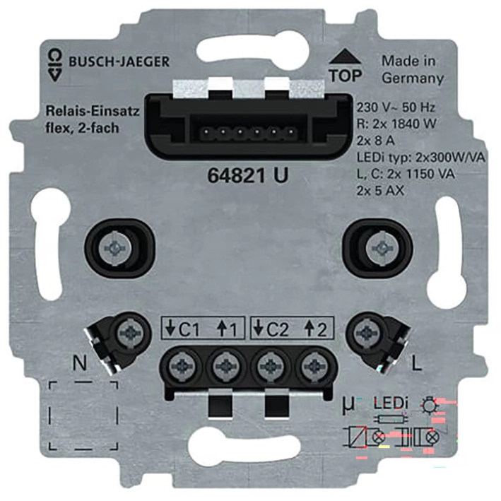 Busch-Jaeger flex-relaissokkel, onderdeel van het Busch-flexTronics®-systeem. 2-voudig voor het schakelen van 2 kanalen, nuldraad vereist. Geschikt voor LED max. 300W. Combineerbaar met nevenpostsokkel 64891 U of impulsdrukker. Min. diepte van de inbouwdoos: 25 mm. Nom. spanning: 230 V. Uitgang: 2 maakcontact (potentaalgebonden).