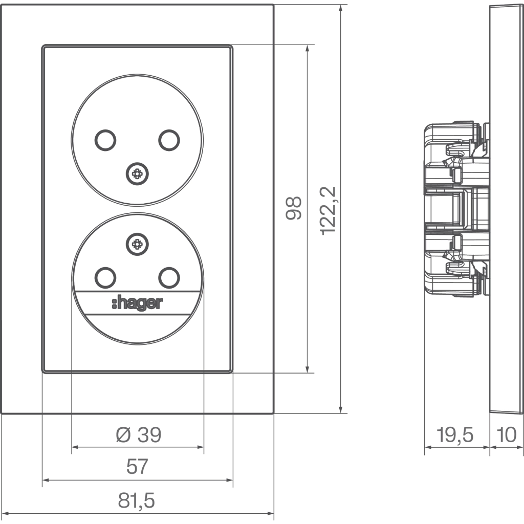 Hager Berker dubbel stopcontact zonder randaarde met verhoogde aanraakbeveiliging. Met volle afdekplaat, A.1, titaan metallic. Gelakt thermoplast. Geschikt voor enkele inbouwdoos.