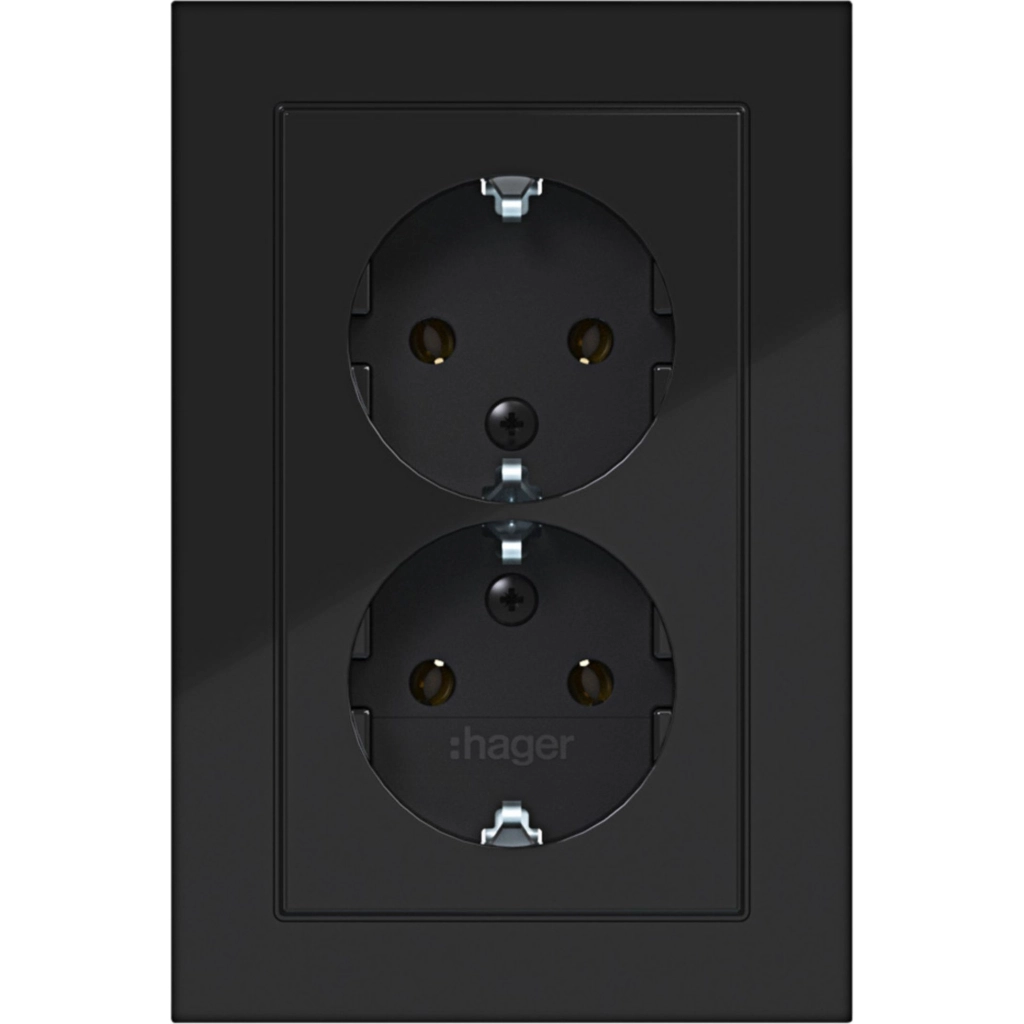 Hager Berker dubbel stopcontact met randaarde. Met volle afdekplaat, A.1, nachtzwart glans. Met klauwbevestiging/spreidklemmen. Geschikt voor enkele inbouwdoos.