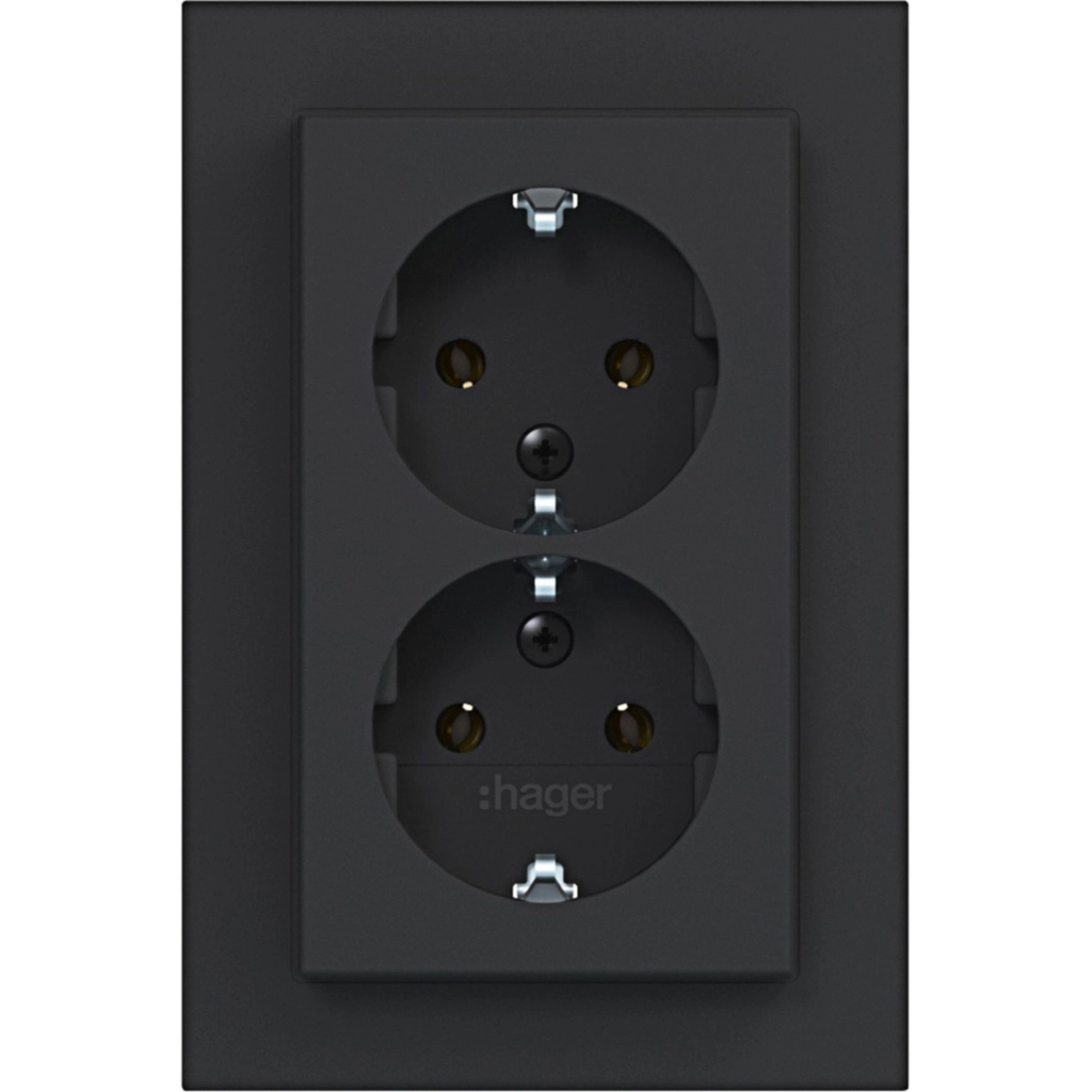 Hager Berker dubbel stopcontact met randaarde. Met volle afdekplaat, A.1, nachtzwart mat. Met klauwbevestiging/spreidklemmen. Geschikt voor enkele inbouwdoos.