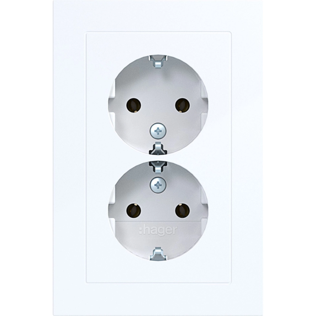 Hager Berker dubbel stopcontact met randaarde. Met volle afdekplaat, A.1, lichtwit glans. Geschikt voor een anderhalve (ovale) inbouwdoos.