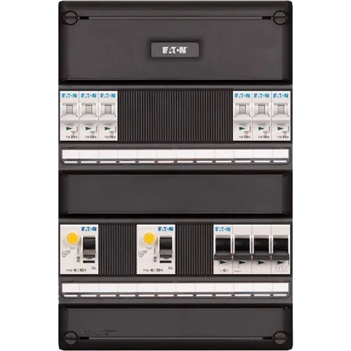 Eaton 1998266 I-62V3400-HS-64 , 3-fase groepenkast. 6 x installatieautomaat 16A, karakteristiek B. 2x aardlekschakelaar 30mA. 1x hoofdschakelaar 4P. Afmetingen hxb: 330x220 mm. Kleur kast: zwart, RAL9005. Meer informatie »