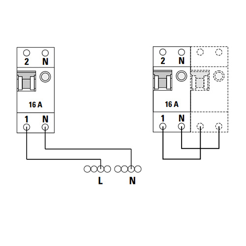 Eaton 1742428 PKN6-16-1N-B-003-A-MW-FLO aardlekautomaat 16A 1p+N 30mA B-karakteristiek 6kA klasse-A FLEX (onder). Voor voeding vanaf aansluitblokken tot montage van de aardlekautomaat op bovenste rail. Meer informatie »