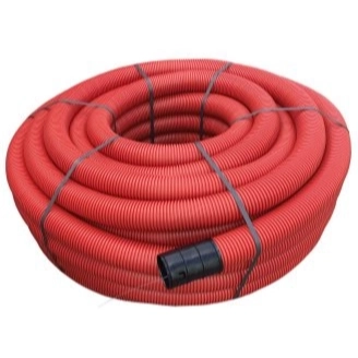 Pipelife flexibele kunststof kabelbeschermingsbuis (wachtbuis/mantelbuis) van PE voor ondergronds gebruik. Met geribde buitenzijde, gladde binnenwand, trekdraad en klikmof. Rood, rol van 50 meter. Buitendiameter: 50 mm, binnendiameter: 40 mm. Meer informatie »