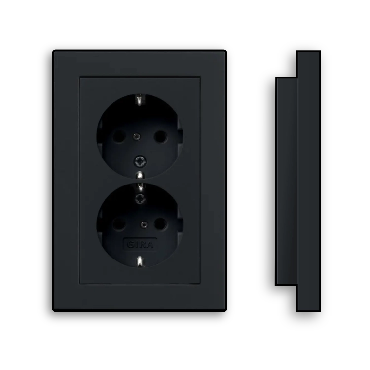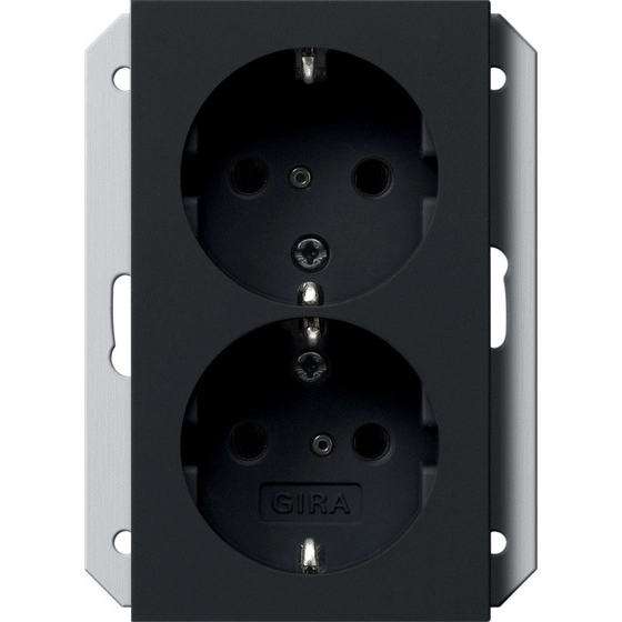 Gira stopcontact met randaarde en verhoogde aanraakbeveiliging, 2-voudig voor enkele inbouwdoos. Systeem 55, zwart mat. Afdekken met een 1,5-voudig afdekraam. Meer informatie »