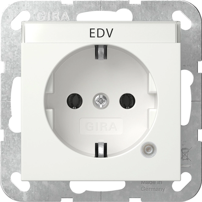 Gira stopcontact met randaarde, controlelamp en tekstkader.Systeem 55, wit glans. Een glimlampenelement en een tekstlabel "EDV" zijn bij de levering inbegrepen. Meer informatie »