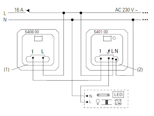 Voeding (fasedraad, bruin) op de L aansluiten van de nevenpost. De aansluitingen gemarkeerd van 1 op zowel de dimmer als nevenpost met een schakeldraad (zwart) verbinden.