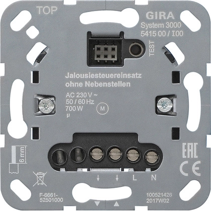 Gira jaloezieschakelaar voor het bedienen van elektrisch aangedreven jaloezieën, rolluiken en markiezen. Nuldraad vereist. Afdekken met Systeem 3000 (tastdimmer)knop / bedieningselement (en afdekraam).