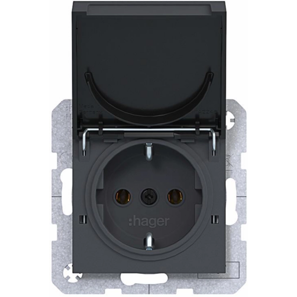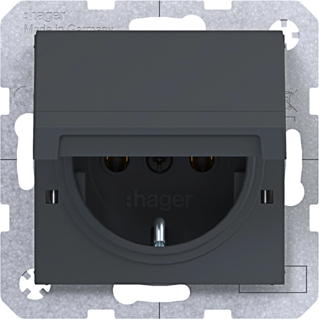 Hager Berker randaarde stopcontact met terugverend klapdeksel (kan in eindstand worden vastgezet), A.1/A.8/C.1/C.8, antraciet mat. Met klauwbevestiging/spreidklemmen. Excl. afdekraam.