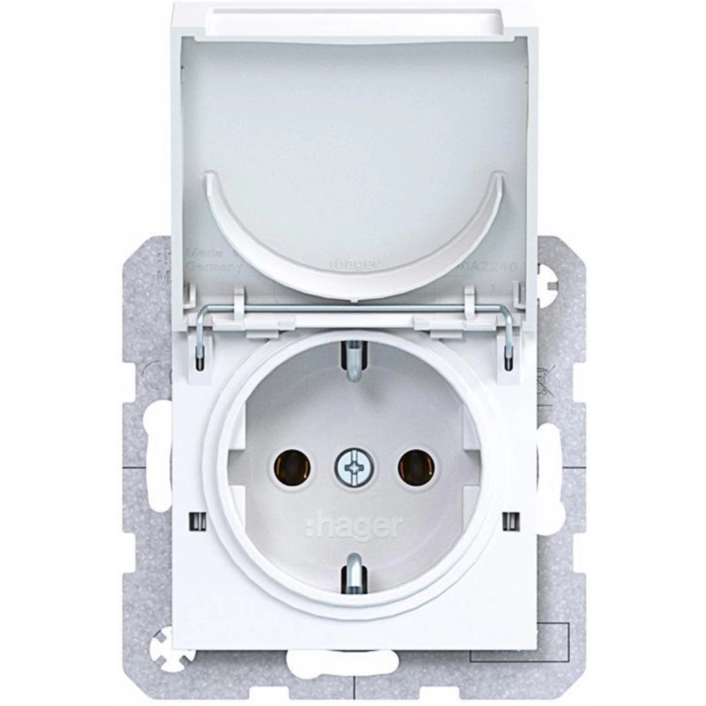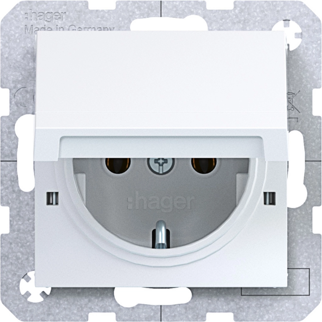 Hager Berker randaarde stopcontact met terugverend klapdeksel (kan in eindstand worden vastgezet), A.1/A.8/C.1/C.8, lichtwit glans. Met klauwbevestiging/spreidklemmen. Excl. afdekraam.