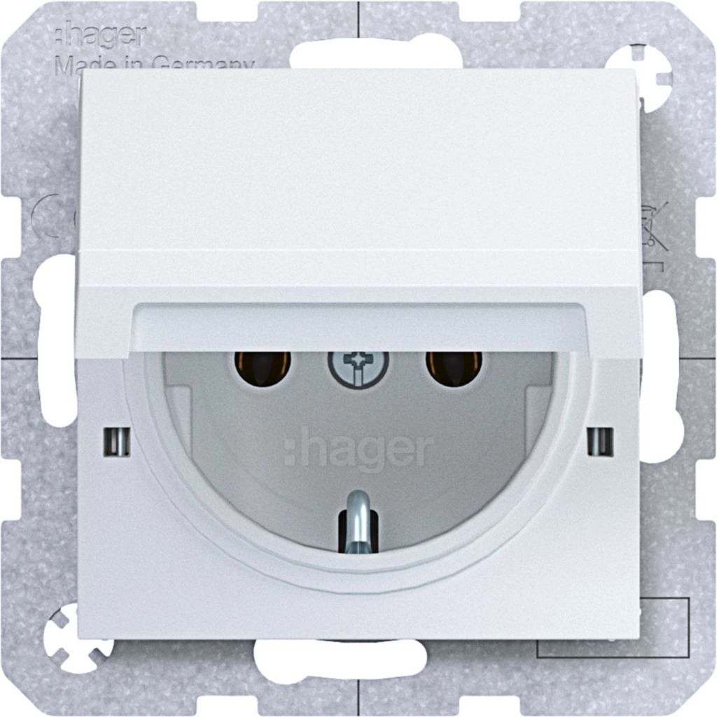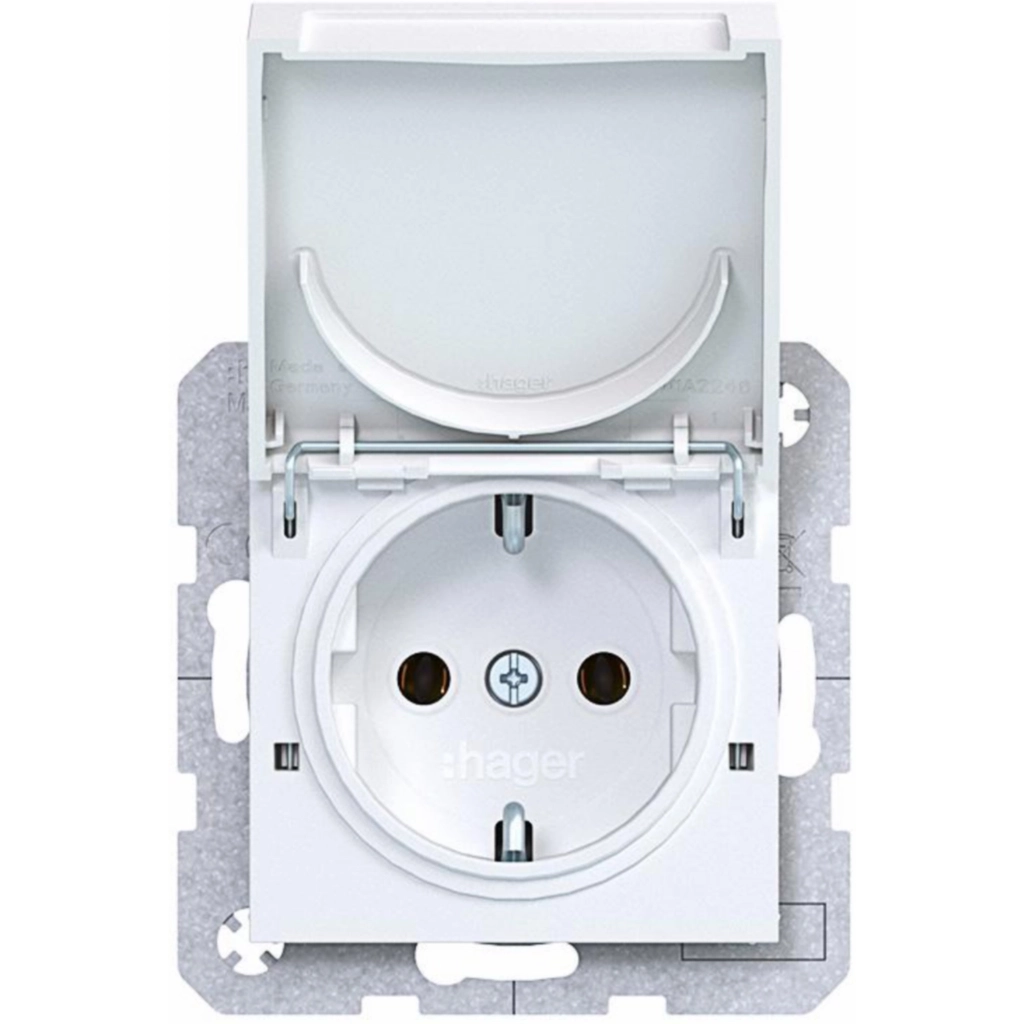 Hager Berker randaarde stopcontact met terugverend klapdeksel (kan in eindstand worden vastgezet), A.1/A.8/C.1/C.8, lichtwit mat. Met klauwbevestiging/spreidklemmen. Excl. afdekraam.