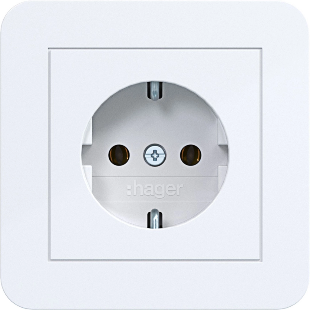 Hager Berker randaarde stopcontact met volle afdekplaat, voor afzonderlijke montage. Met klauwbevestiging/spreidklemmen. Incl. afdekraam C.1, lichtwit glans.