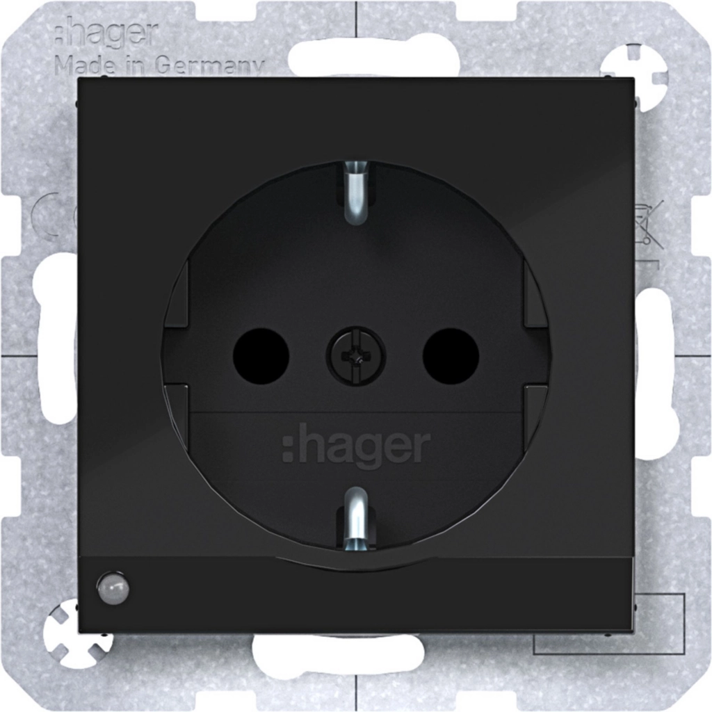 Hager Berker randaarde stopcontact met verhoogde aanraakbeveiliging en LED-oriëntatielicht., A.1/A.8/C.1/C.8, nachtzwart glans. Met klauwbevestiging/spreidklemmen. Excl. afdekraam.
