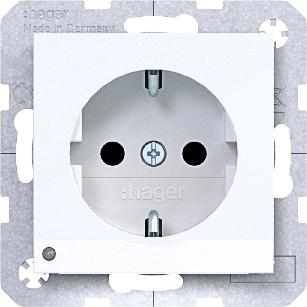 Hager Berker randaarde stopcontact met verhoogde aanraakbeveiliging en LED-oriëntatielicht., A.1/A.8/C.1/C.8, lichtwit glans. Met klauwbevestiging/spreidklemmen. Excl. afdekraam.