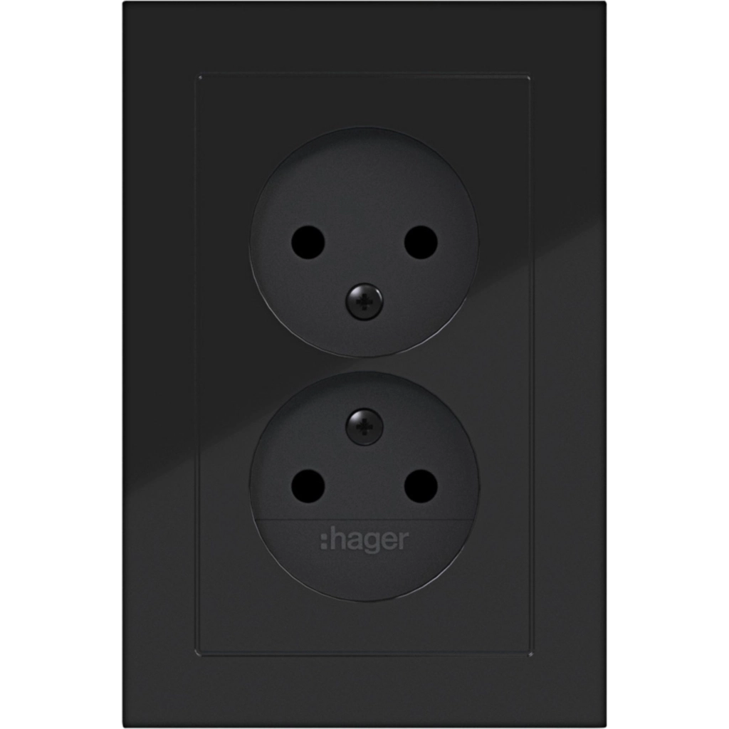 Hager Berker dubbel stopcontact zonder randaarde met verhoogde aanraakbeveiliging. Met volle afdekplaat, A.1, nachtzwart glans. Geschikt voor enkele inbouwdoos.