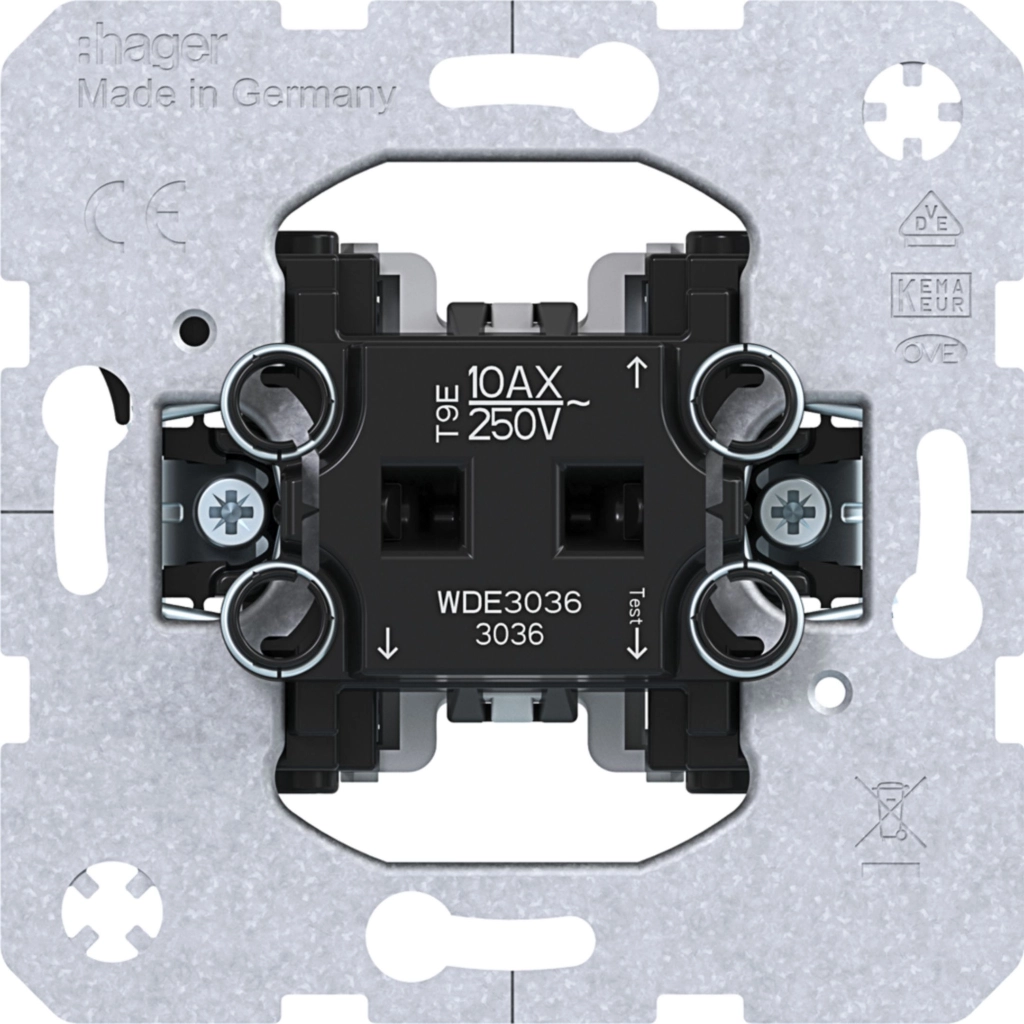 Hager Berker standaard 1-polige wisselschakelaar, geschikt voor wisselschakeling (hotelschakeling), 10 A. Met klauwbevestiging (spreidklemmen). Excl. schakelwip en afdekraam.