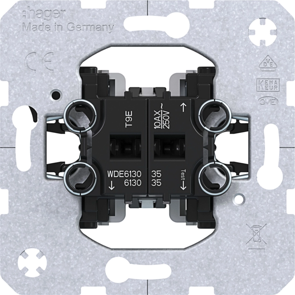 Hager Berker serieschakelaar voor het schakelen van twee afzonderlijke lichtpunten, 10 A. Niet geschikt voor wisselschakelingen. Zonder klauwbevestiging (spreidklemmen). Excl. schakelwip en afdekraam.