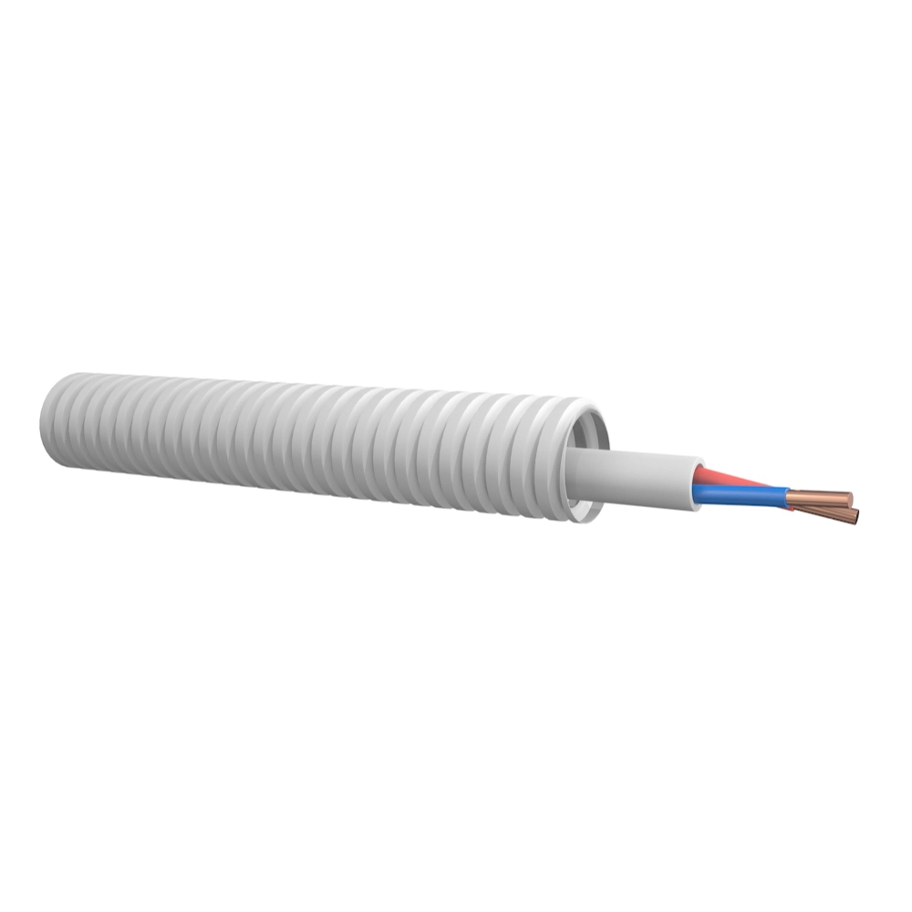 Flexibele buis voorbedraad met 3 x 2,5 mm² installatiedraad (bruin, blauw en groen/geel). Diameter van de buis 16 mm (5/8), flexibel, Polypropyleen (PP), grijs. Meer informatie »