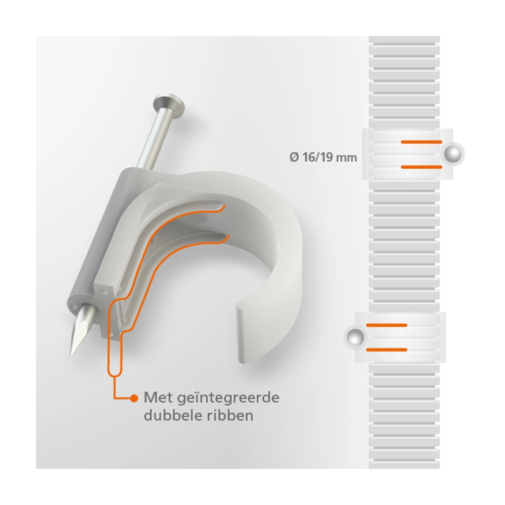 Spijkerclips speciaal ontworpen voor flexibele buizen met een diameter rond 16 - 20 mm. De clips hebben geïntegreerde dubbele fixeerribben aan de binnenkant, deze ribben komen overeen met de sparingen in de flexbuis. Kleur: transparant, 100 stuks. Meer informatie »