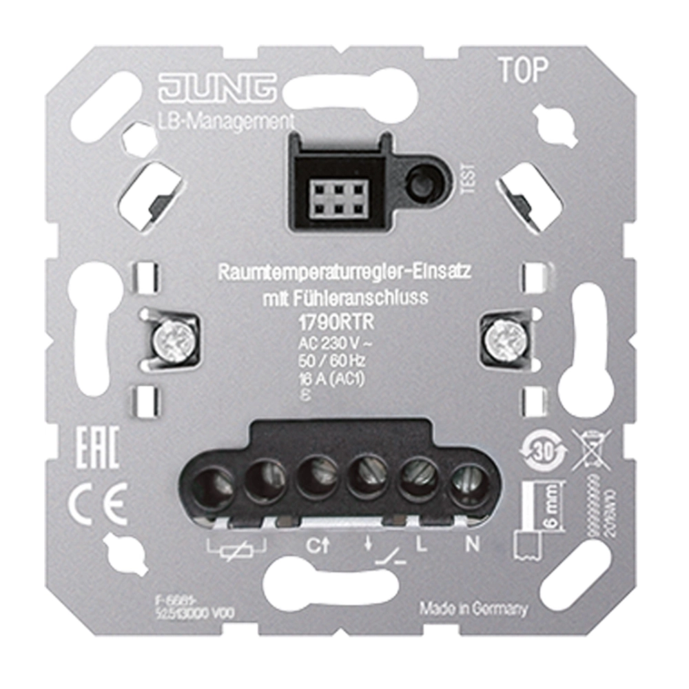 JUNG kamerthermostaat met voeleraansluiting zonder ingang nevenpost. Regeling van elektrische vloerverwarmingen en elektrothermische ventielaandrijvingen. Pulsbreedtemodulatie (PWM) of tweepuntsregeling (aan/uit). Excl. knop en sensor.