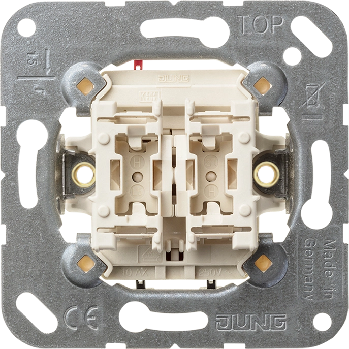 JUNG serieschakelaar, 10A/250V AC, voor het schakelen van 2 lichtpunten vanaf 1 plek. Bedrading aansluiten met insteekklemmen. Excl. schakelwip en afdekraam. Zonder klauwbevestiging.
