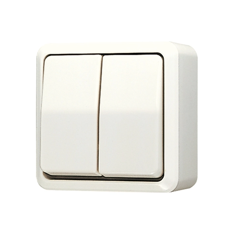 JUNG opbouw dubbele wisselschakelaar, 10 A/ 250 V AC, AP 600, crème. Voor het schakelen van twee afzonderlijke lichtpunten vanaf twee of meerdere locaties. Bedrading aansluiten met insteekklemmen. Exclusief bodemplaat.