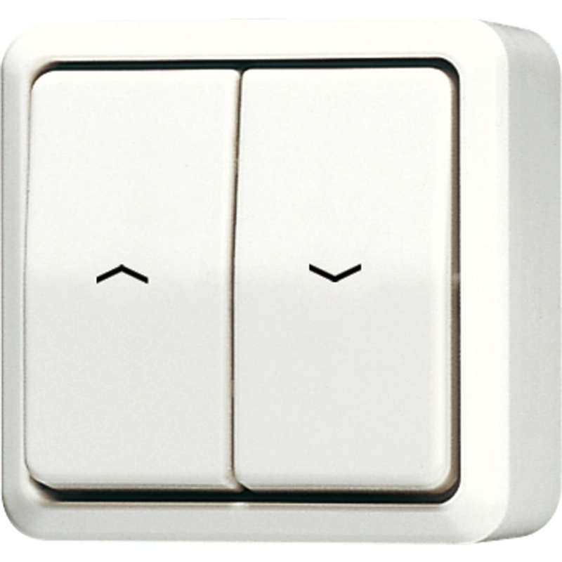 JUNG opbouw jaloezieschakelaar 1-polig, 10A 250V AC, met omkeervergrendeling, AP 600, crème. Voor bediening van jaloezieën, rolluiken en markiezen. Bedrading aansluiten met insteekklemmen. Exc. bodemplaat.