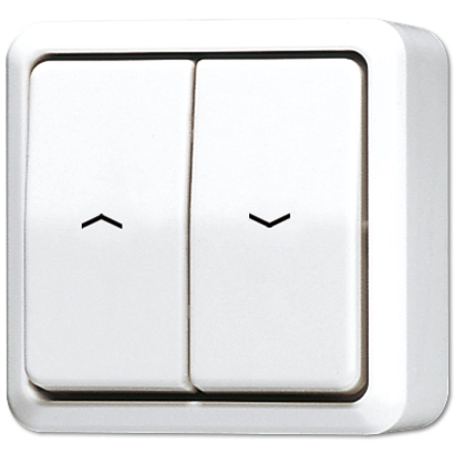 JUNG opbouw jaloezieschakelaar 1-polig, 10A 250V AC, met omkeervergrendeling, AP 600, alpine wit. Voor bediening van jaloezieën, rolluiken en markiezen. Bedrading aansluiten met insteekklemmen. Exc. bodemplaat.