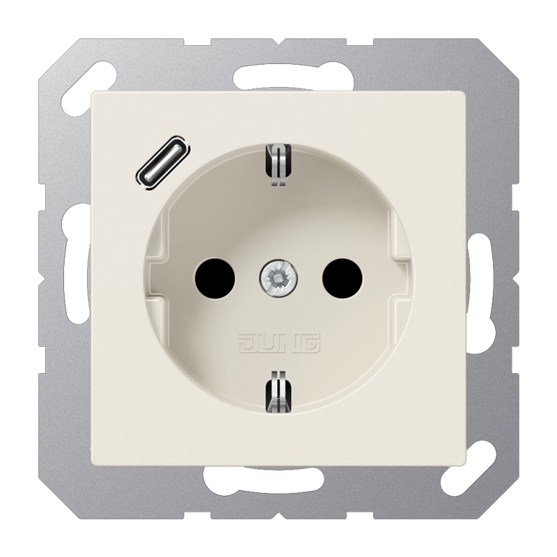 JUNG stopcontact met randaarde, verhoogde aanraakbeveiliging en één USB-C poort. A-range, crème. Geschikt voor inbouwdozen met een minimale diepte van 57 mm. Thermoplast (hoogglans). Excl. afdekraam.