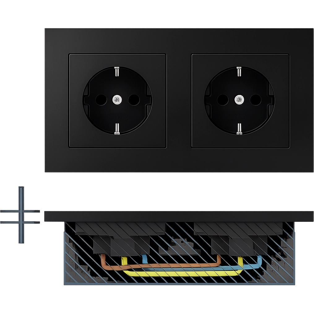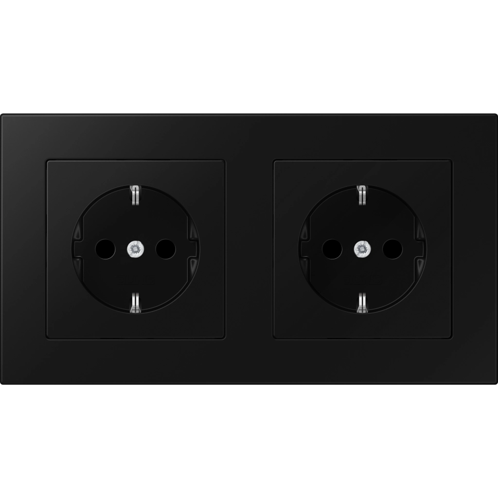 JUNG stopcontact 2-voudig met randaarde, incl. afdekraam en voorbedraad, A 550, grafietzwart mat. Voor tweevoudige inbouwdozen (past niet in twee enkele). Bedrading aansluiten met insteekklemmen. Thermoplast (mat gelakt).
