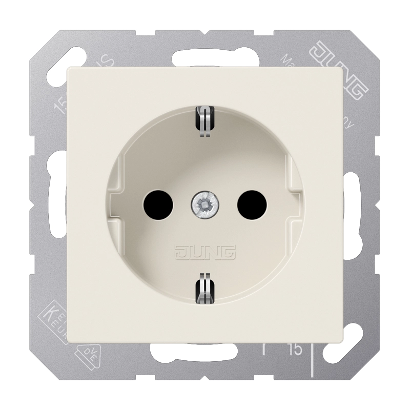 JUNG stopcontact met randaarde en klauwbevestiging, A-range, crème. Bedrading aansluiten met insteekklemmen, de draagring is aangesloten op de aardverbinding. Duroplast, zeer krasvast en glanzend. Excl. afdekraam.
