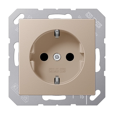 JUNG stopcontact met randaarde, A-range, champagne. Bedrading aansluiten met insteekklemmen, de draagring is aangesloten op de aardverbinding. Duroplast (gelakt), zeer krasvast. Excl. afdekraam.
