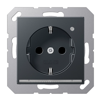 JUNG stopcontact met randaarde, Safety+, LED-oriëntatieverlichting en geïntegreerde lichtsensor, A-range, antraciet mat. Bedrading aansluiten met insteekklemmen. Vereist een diepe inbouwdoos (min. 50 mm). Thermoplast (mat gelakt). Excl. afdekraam.