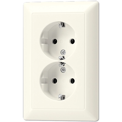 JUNG 'vlak' stopcontact 2-voudig met randaarde, incl. afdekraam en geschikt voor een anderhalve (ovale) inbouwdoos, AS 500, crème. Bedrading aansluiten met insteekklemmen. Duroplast, zeer krasvast en glanzend.