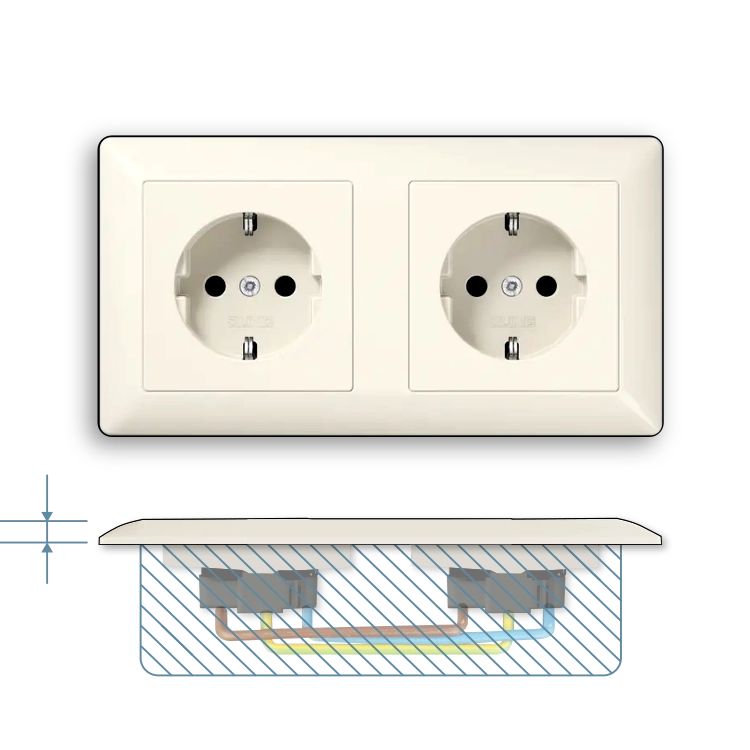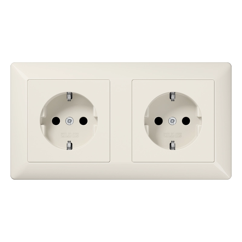 Wandcontactdoos met beschermingscontact 16 A 250 V ~ voor wandgoot. Met insteekklemmen voor aders tot 2,5 mm². Met draagring en geïntegreerd afdekraam. Afmeting: 80,5 x 151,5 mm. Serie: AS 500, kleur: creme glans.